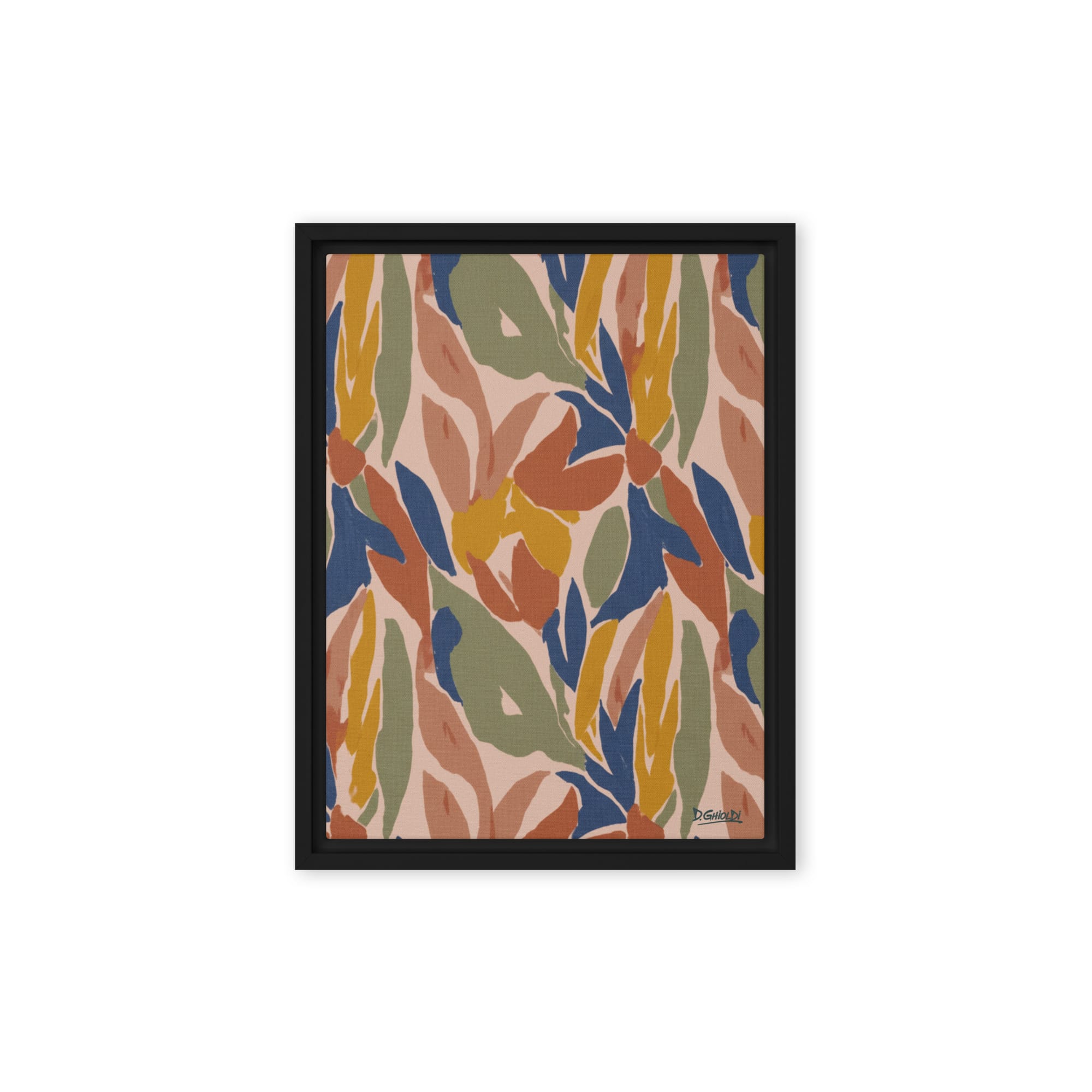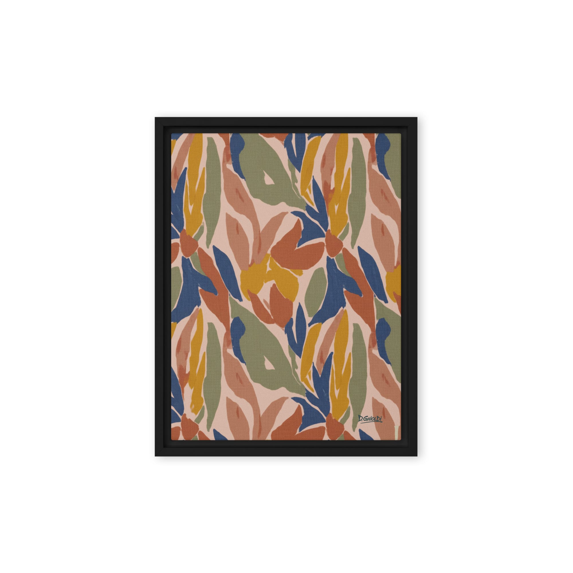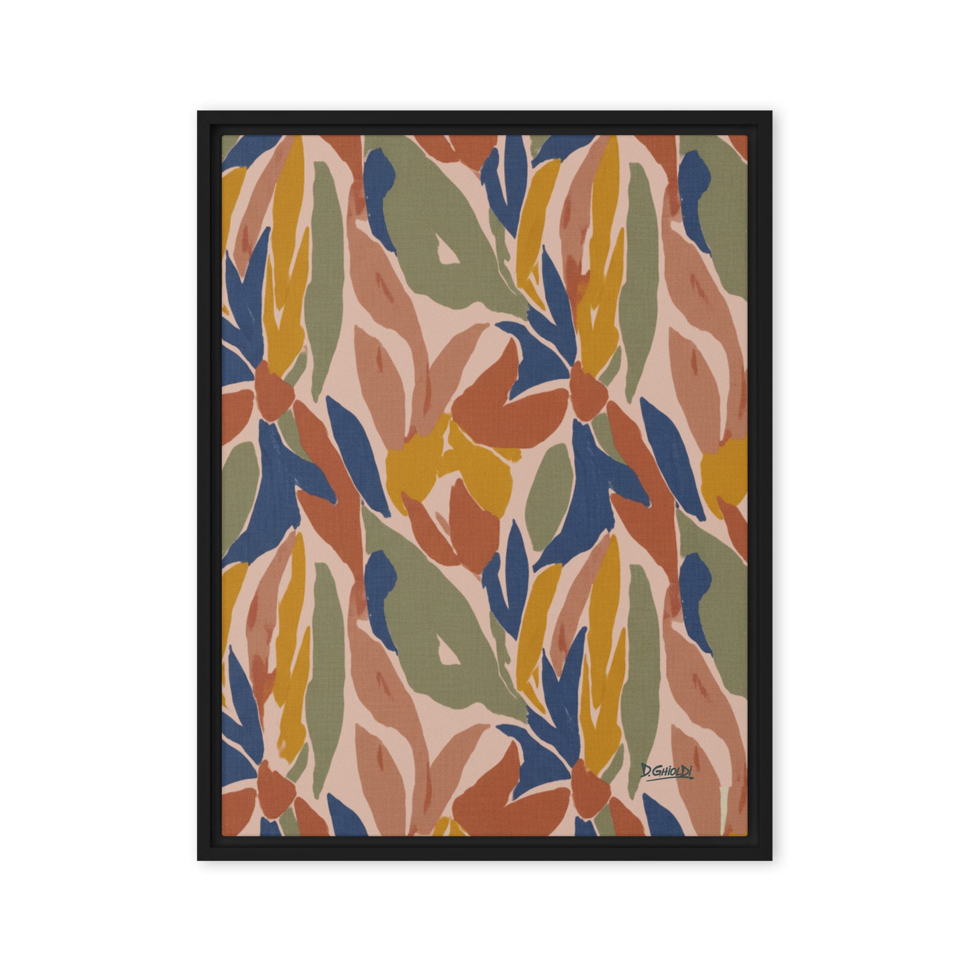 Abstract Floral Harmony – Modern Earth Tone Framed Canvas Art | Ghioldi Rosano. Introduce a touch of contemporary nature to your walls with ‘Abstract Floral Harmony’. This standout piece from the Ghioldi Rosano Botanical Series explores the fluidity of floral forms through a rich palette of terracotta, warm ochre, and balanced indigo accents.