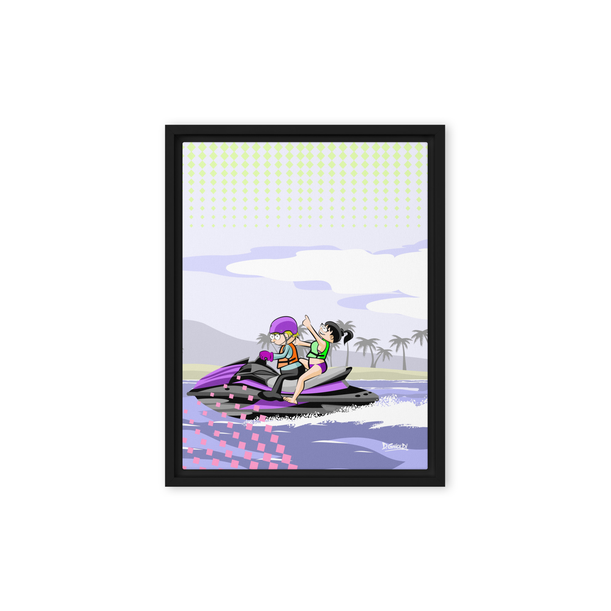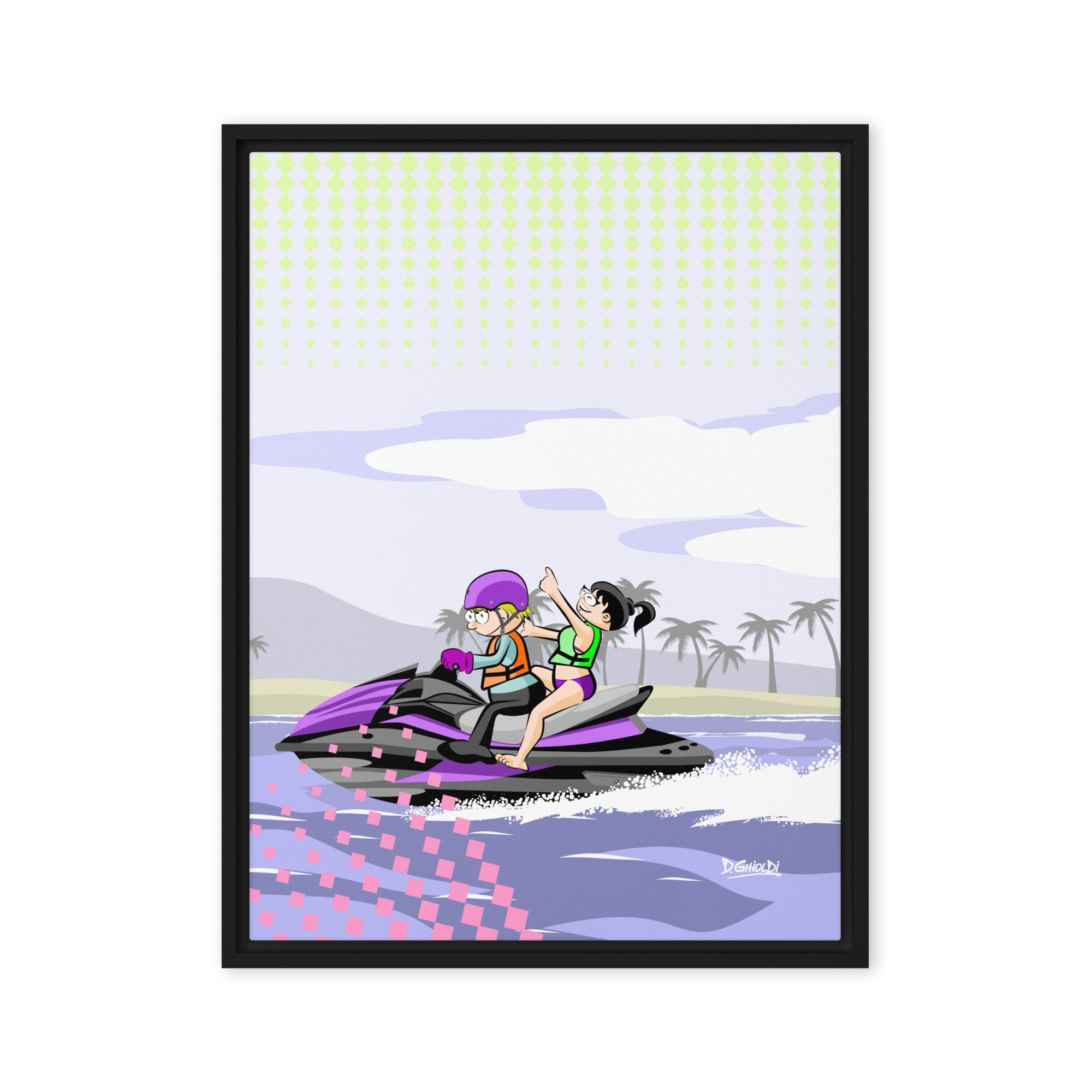 Jet Ski Ride: Summer Adventure pop art illustration of two characters on a purple jet ski with palm trees in the background from the Los Monitos collection by D. Ghioldi.
