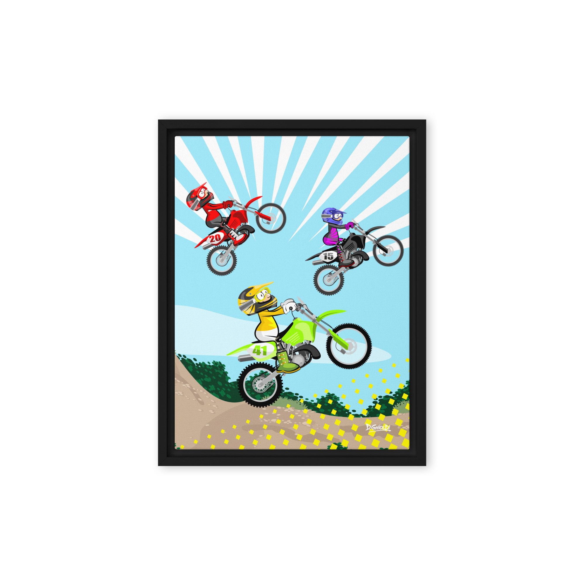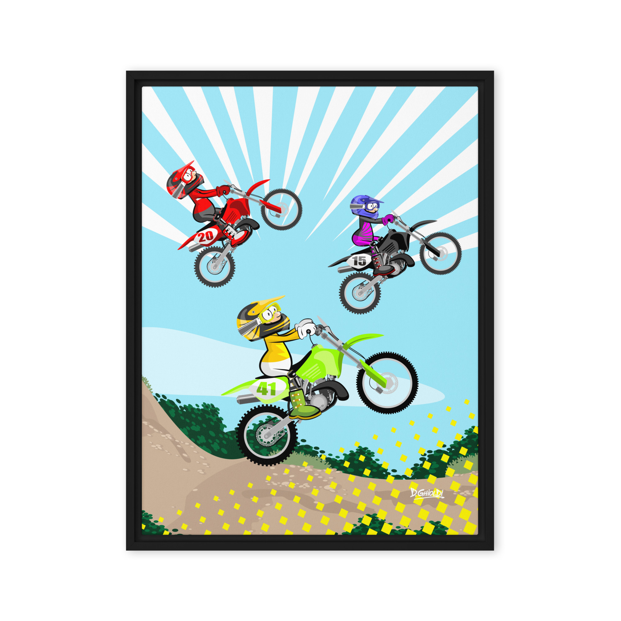 Studio Ghioldi Rosano is thrilled to introduce the motor-sports series within the official ‘Los Monitos’ collection by D. Ghioldi. This piece, registered in the National Library of Uruguay, captures the thunderous excitement of a Motocross race.